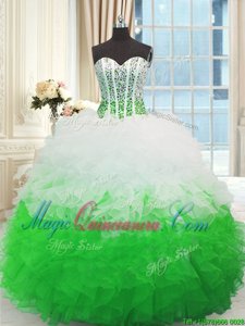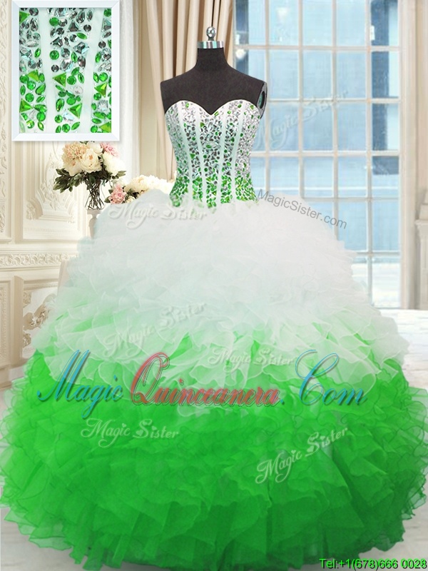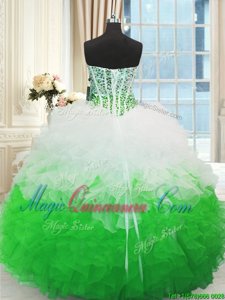 Custom Made Floor Length White and Green Quinceanera Dresses Organza Sleeveless Beading and Ruffles