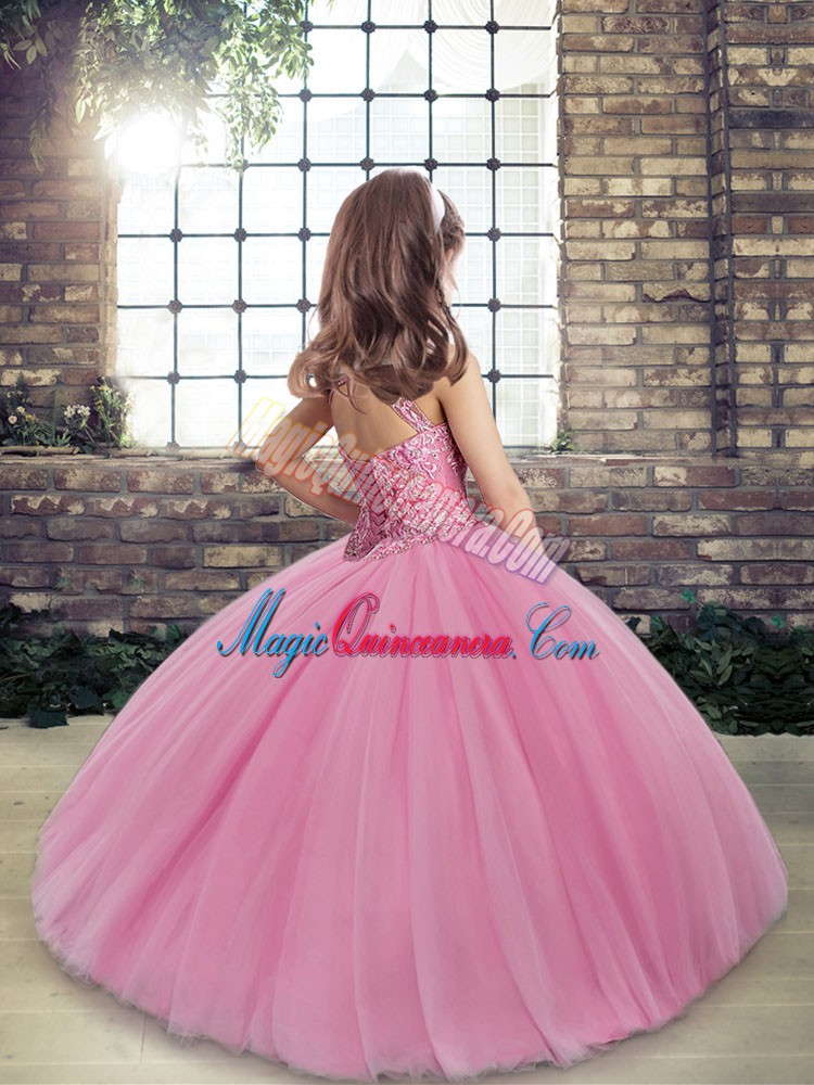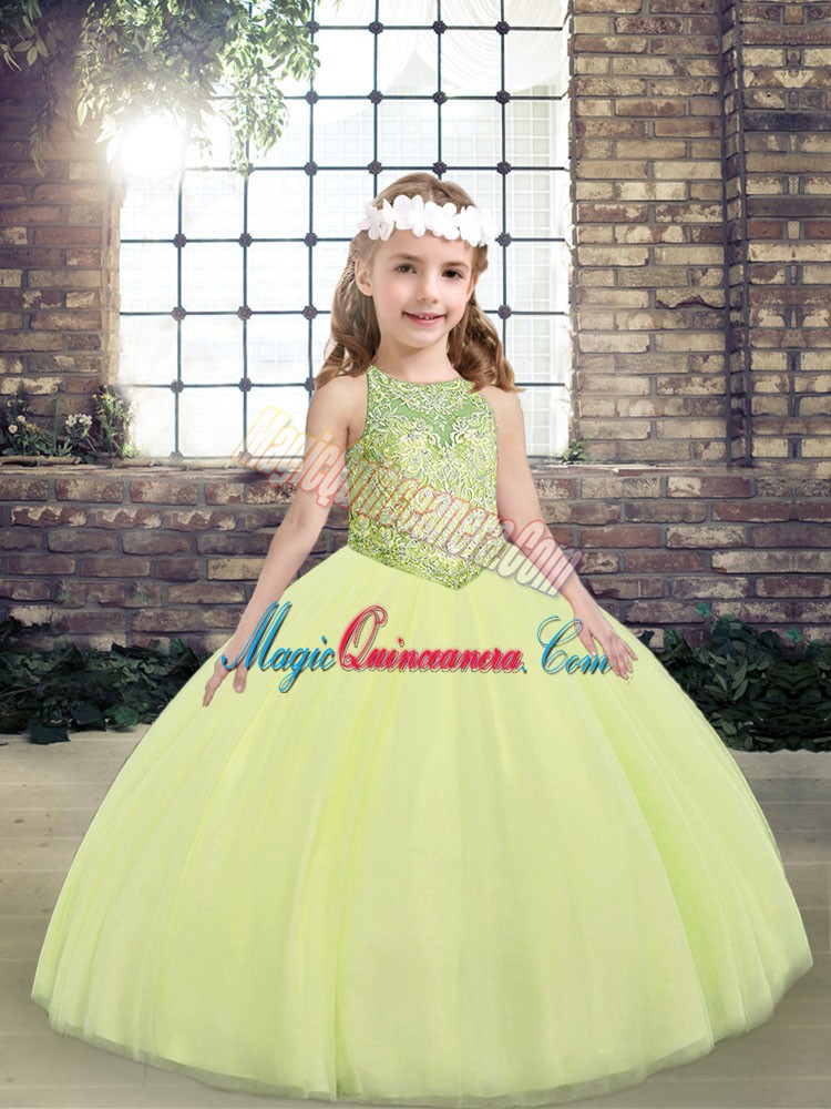 Custom Made Light Yellow Sleeveless Floor Length Beading Lace Up Little Girls Pageant Dress