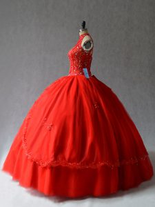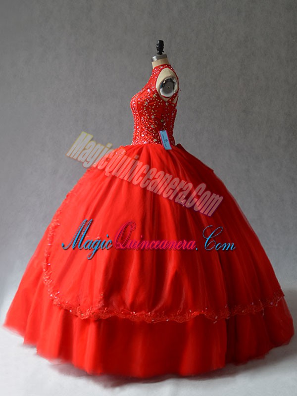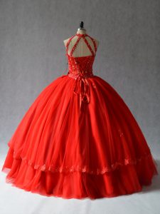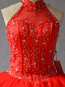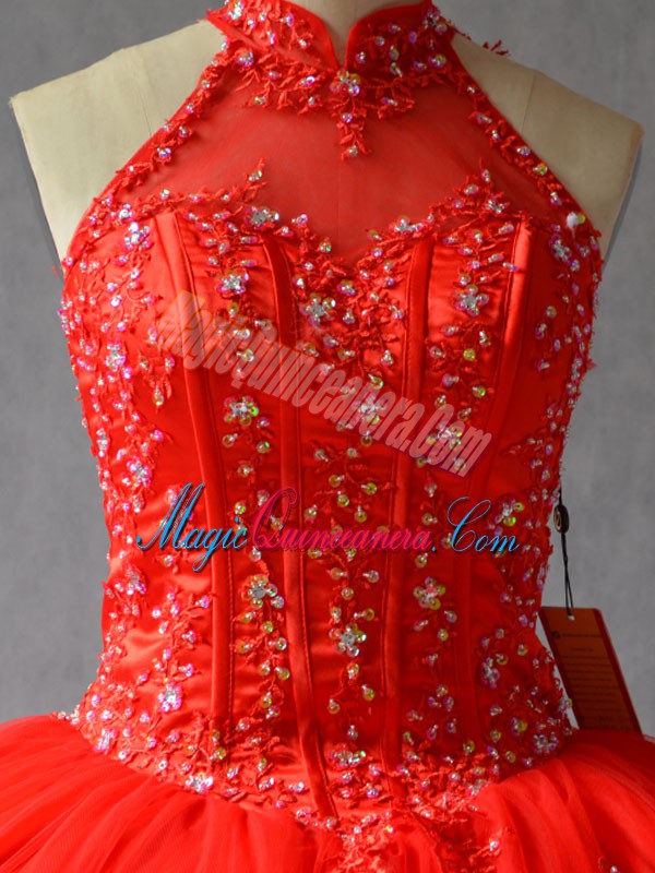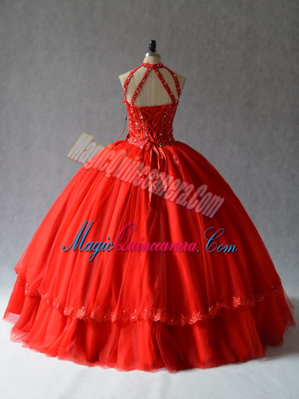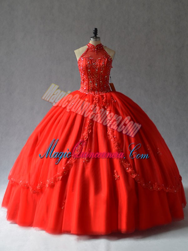 Custom Made Red Ball Gowns Tulle Halter Top Sleeveless Appliques Floor Length Lace Up Sweet 16 Dresses
