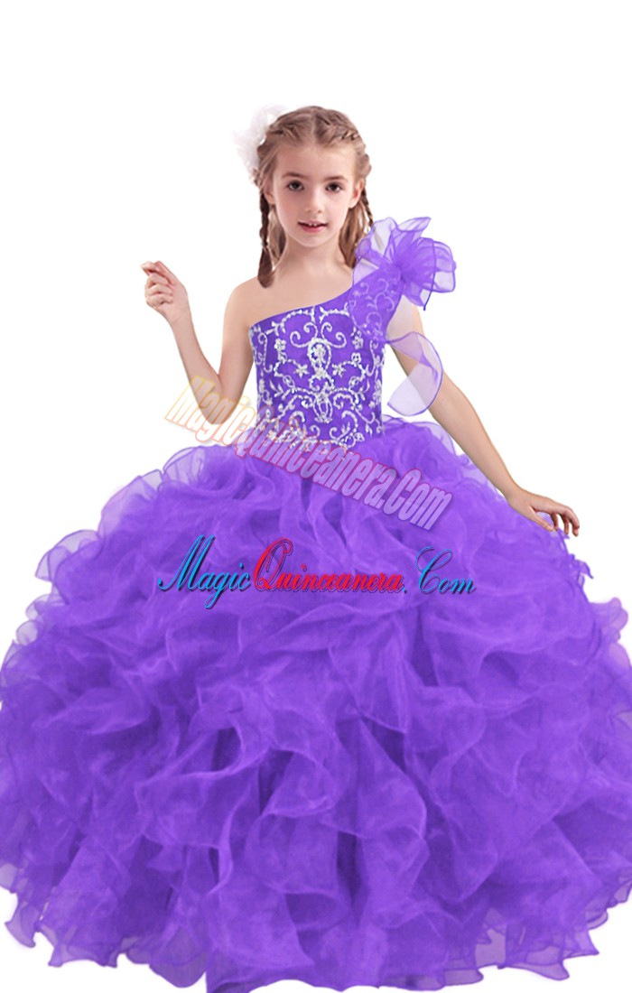 Customized Ball Gowns Winning Pageant Gowns Lilac One Shoulder Organza Sleeveless Floor Length Lace Up
