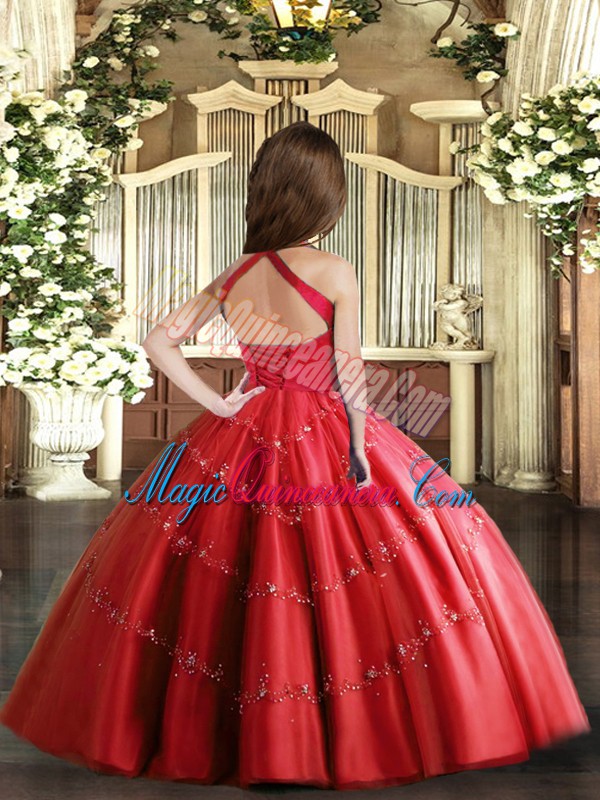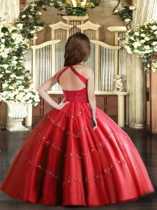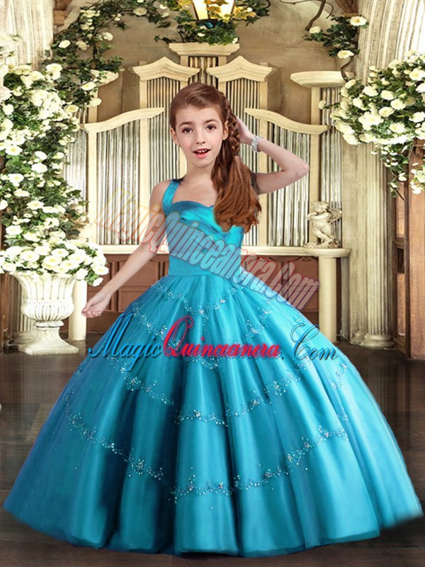 Customized Floor Length Lace Up Little Girl Pageant Gowns Baby Blue for Party and Wedding Party with Beading