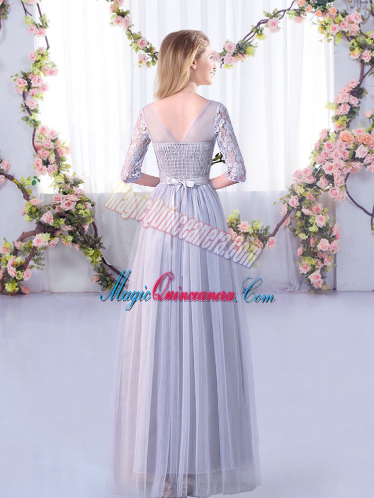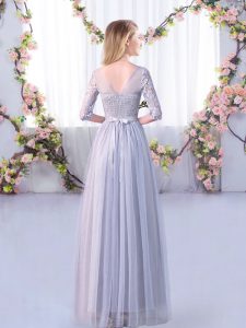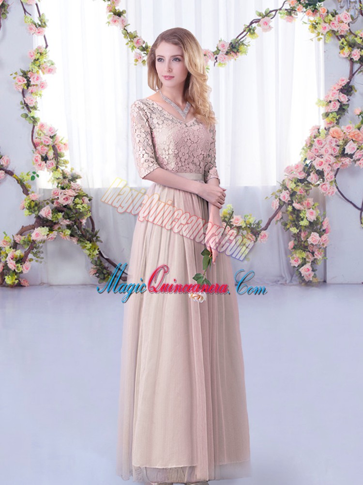 Customized Half Sleeves Floor Length Lace and Belt Side Zipper Quinceanera Court of Honor Dress with Pink