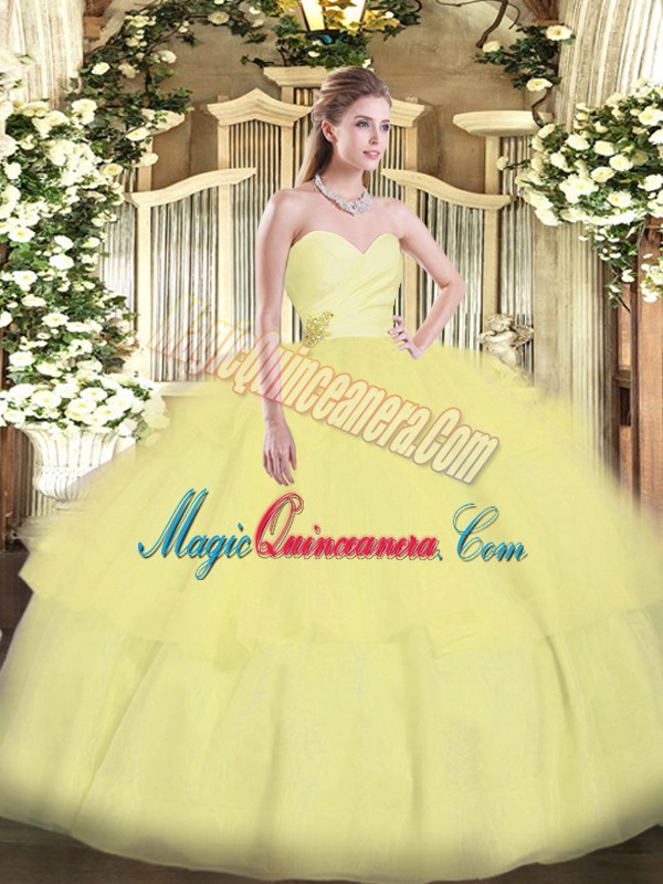 Customized Light Yellow Organza Lace Up Sweetheart Sleeveless Floor Length Quinceanera Gown Beading and Ruffled Layers