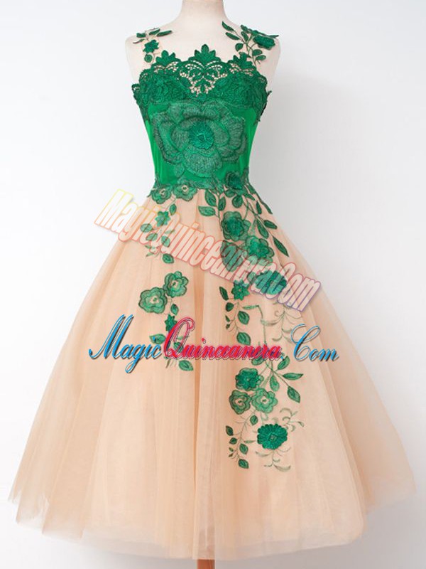 Customized Peach Lace Up Straps Appliques Quinceanera Court of Honor Dress Tulle Sleeveless