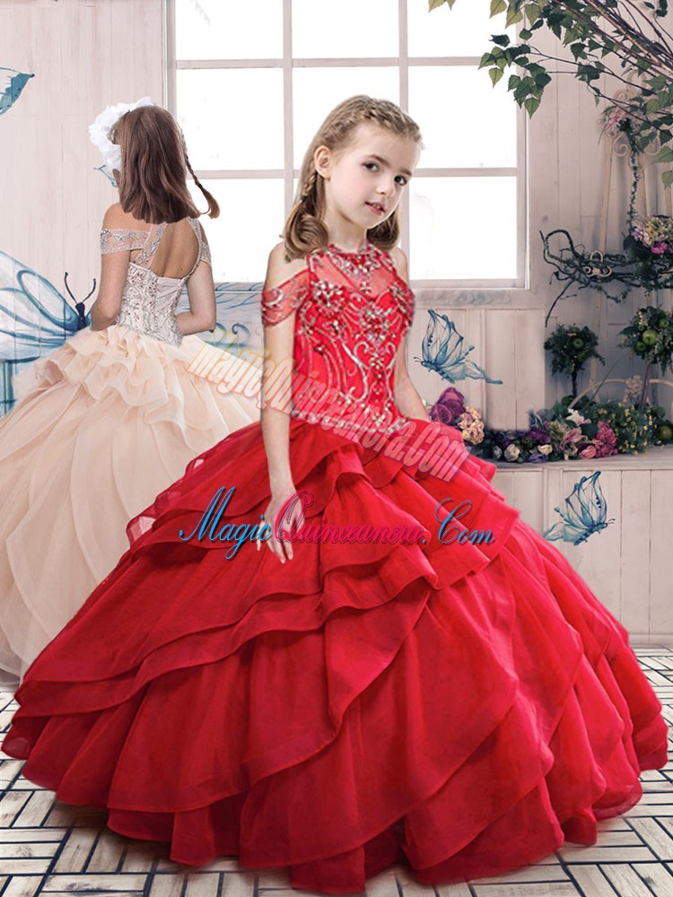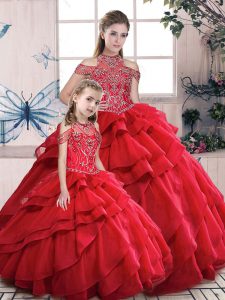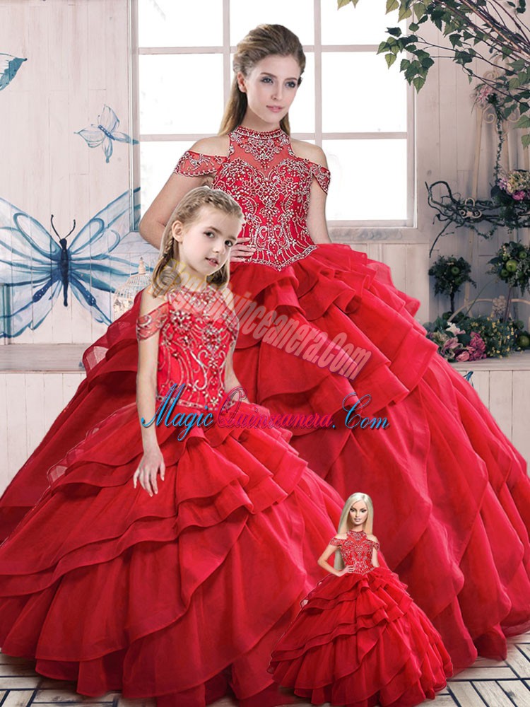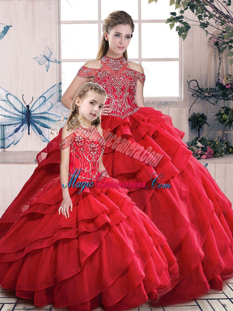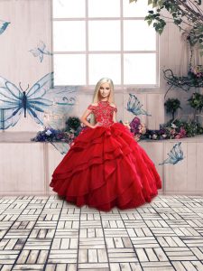 Customized Red Organza Lace Up 15 Quinceanera Dress Sleeveless Floor Length Beading and Ruffles