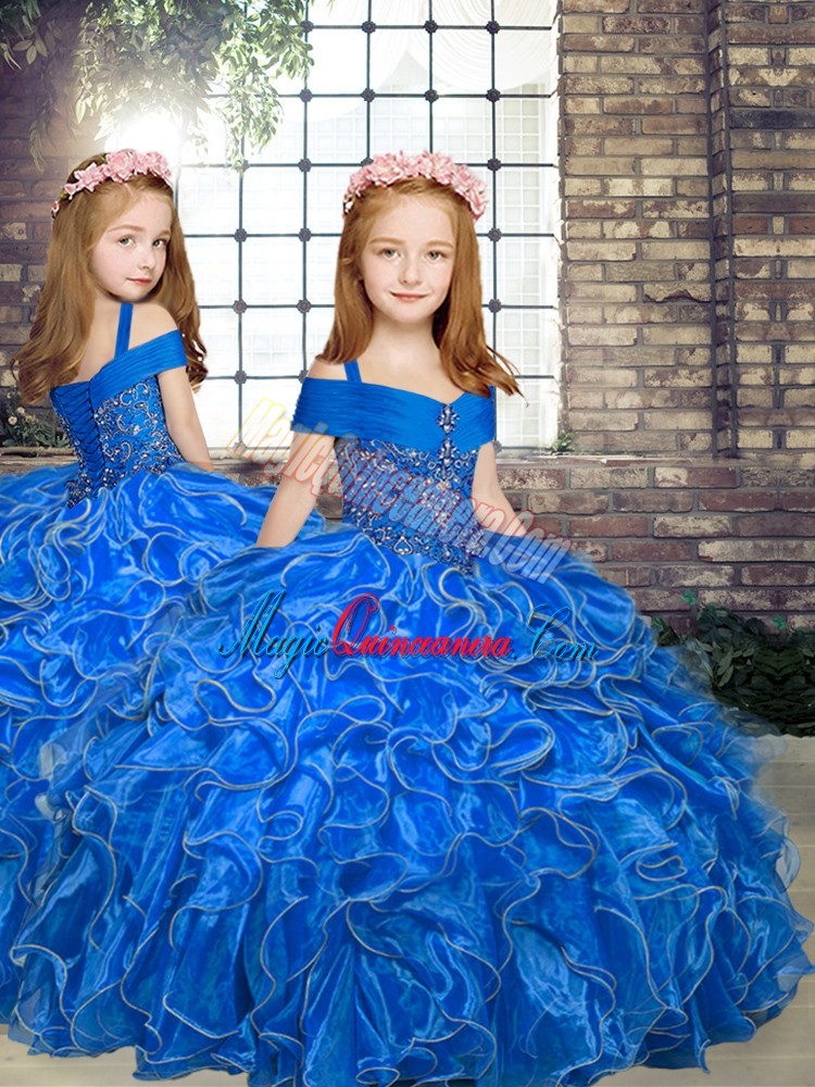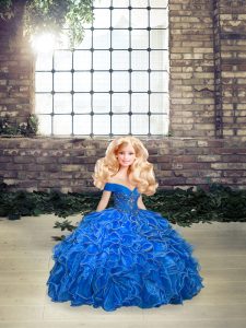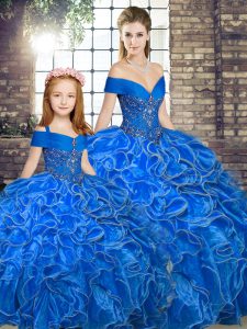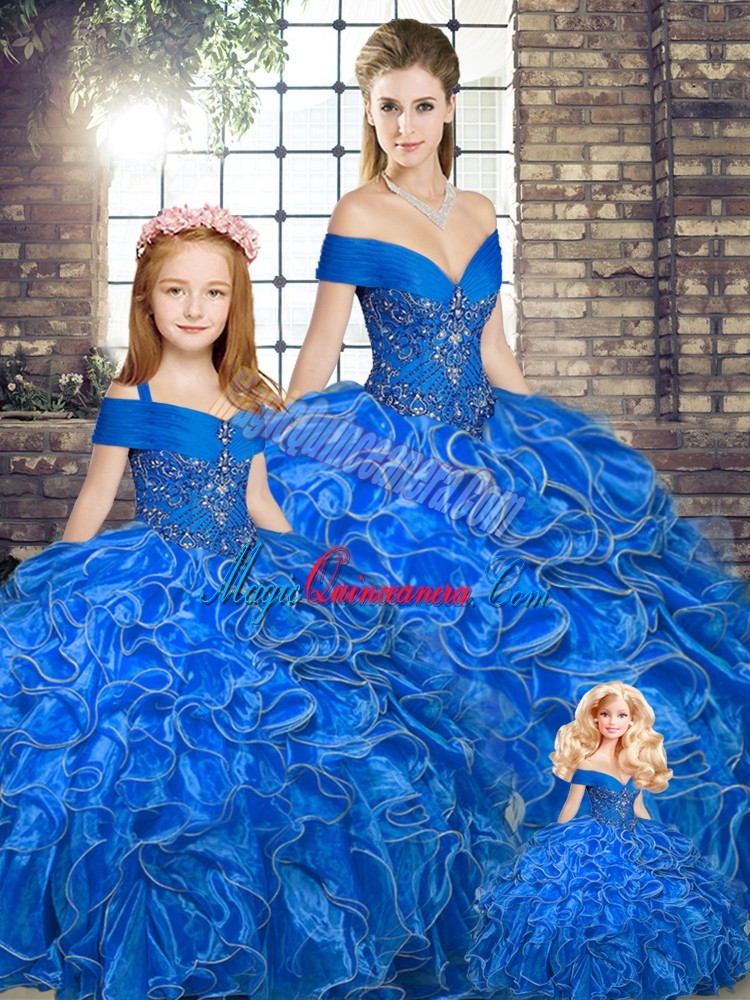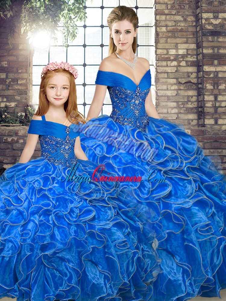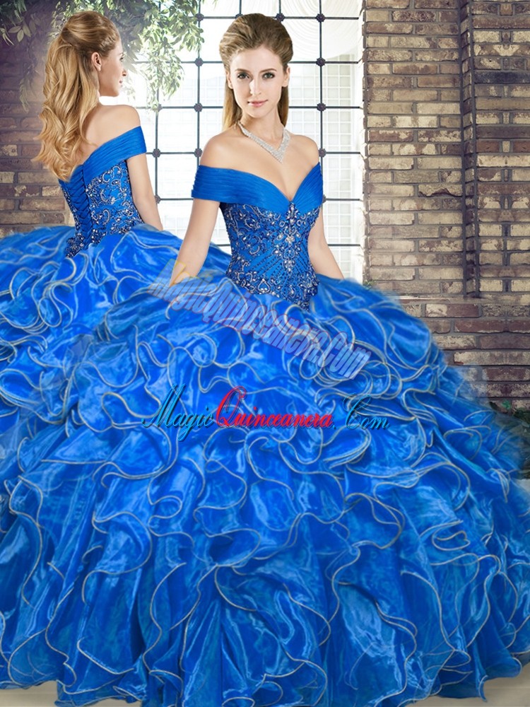 Customized Royal Blue Organza Lace Up Off The Shoulder Sleeveless Floor Length Quinceanera Dresses Beading and Ruffles