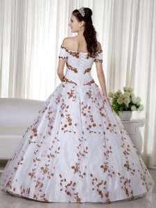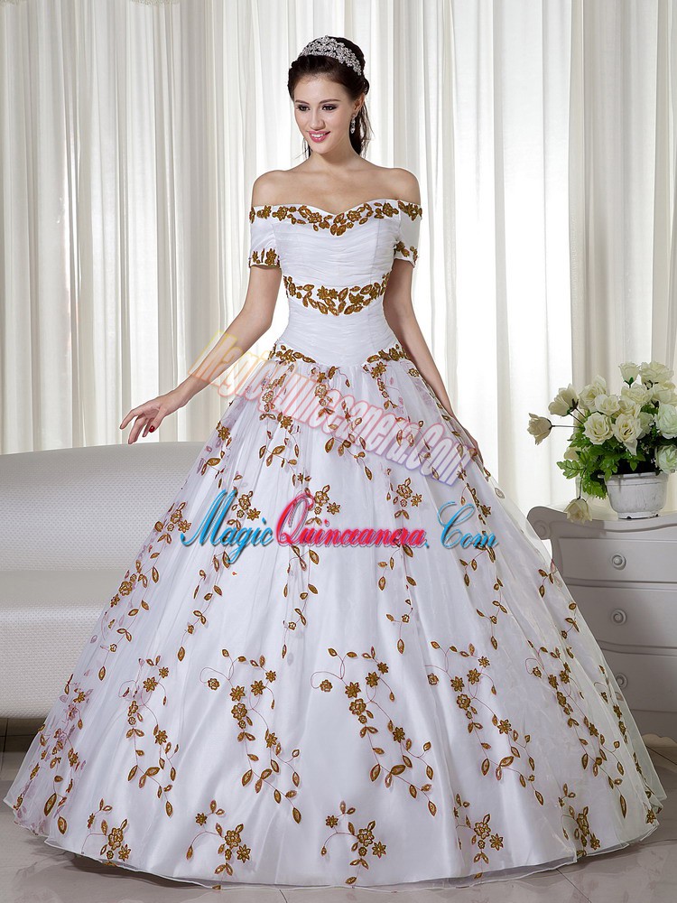 Customized Short Sleeves Organza Floor Length Lace Up Quinceanera Dresses in White with Embroidery
