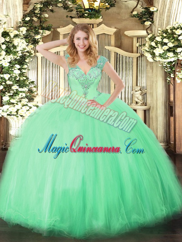 Cute Apple Green V-neck Lace Up Beading Vestidos de Quinceanera Sleeveless