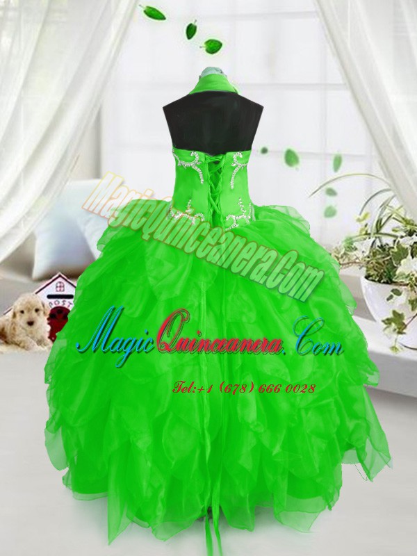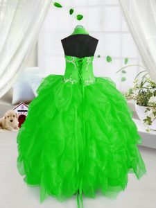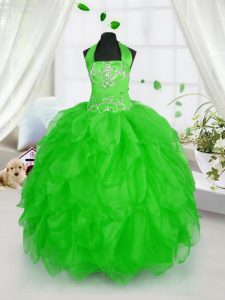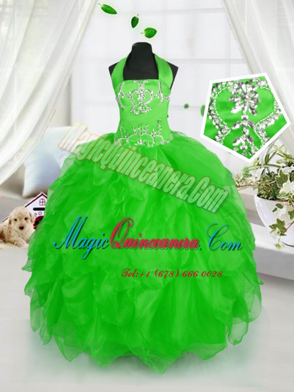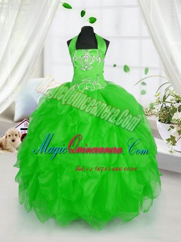 Cute Ball Gowns Halter Top Sleeveless Organza Floor Length Lace Up Appliques and Ruffles Pageant Dress Toddler