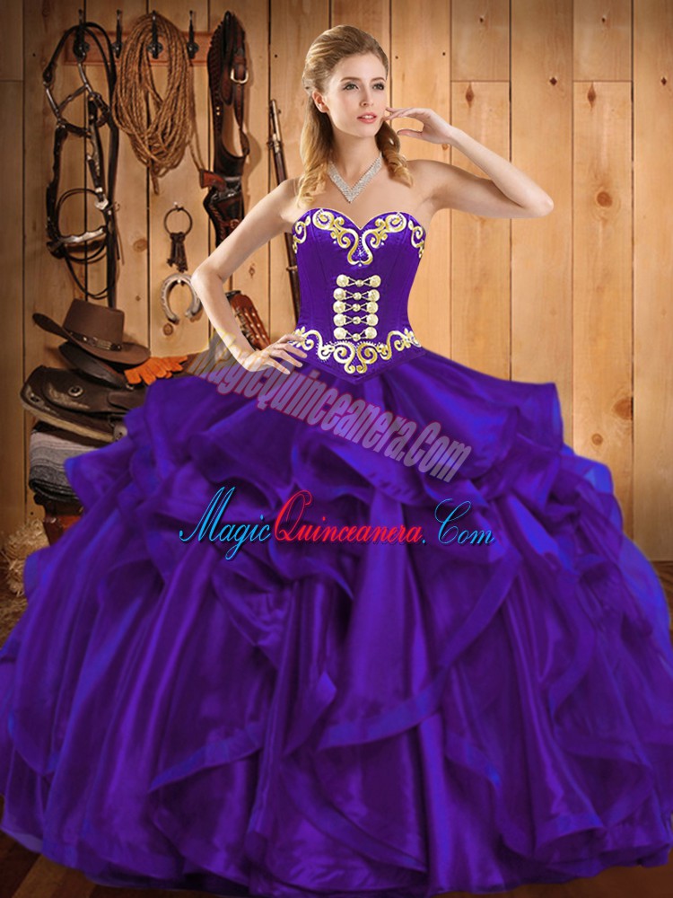 , Cute Floor Length Purple Quinceanera Gown Organza Sleeveless Embroidery and Ruffles