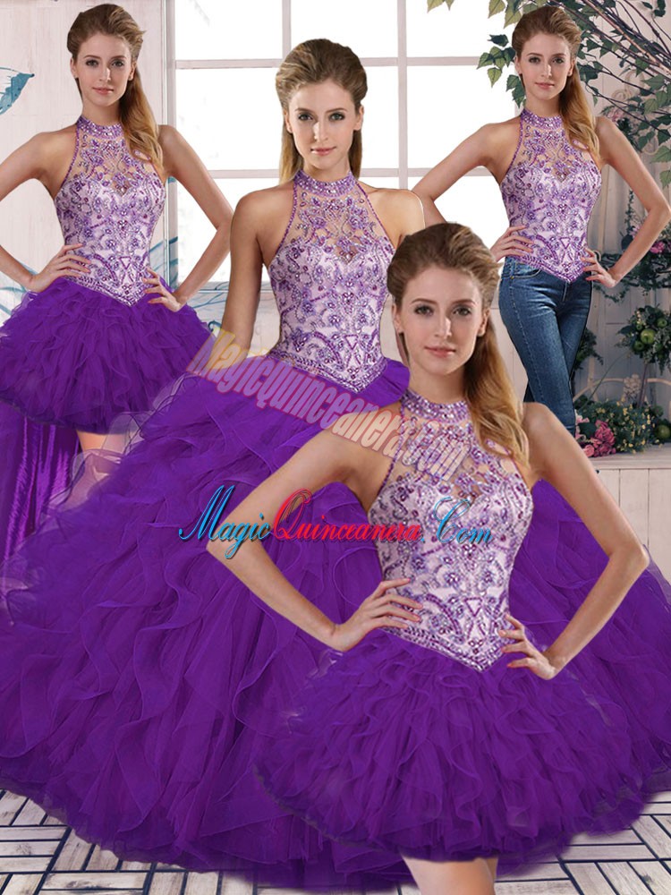 , Cute Halter Top Sleeveless Lace Up Vestidos de Quinceanera Purple Tulle