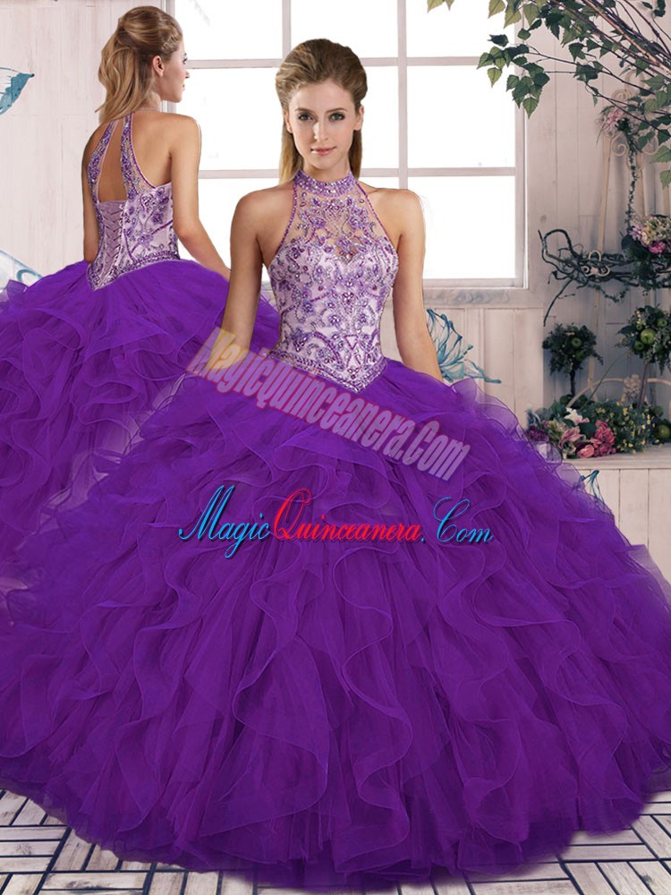 Cute Halter Top Sleeveless Lace Up Vestidos de Quinceanera Purple Tulle