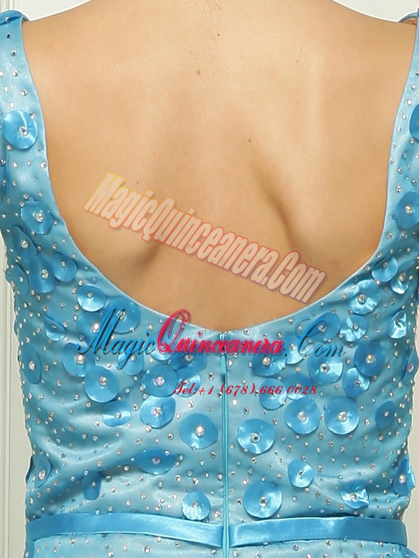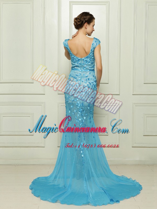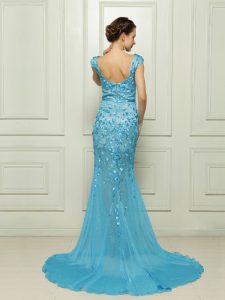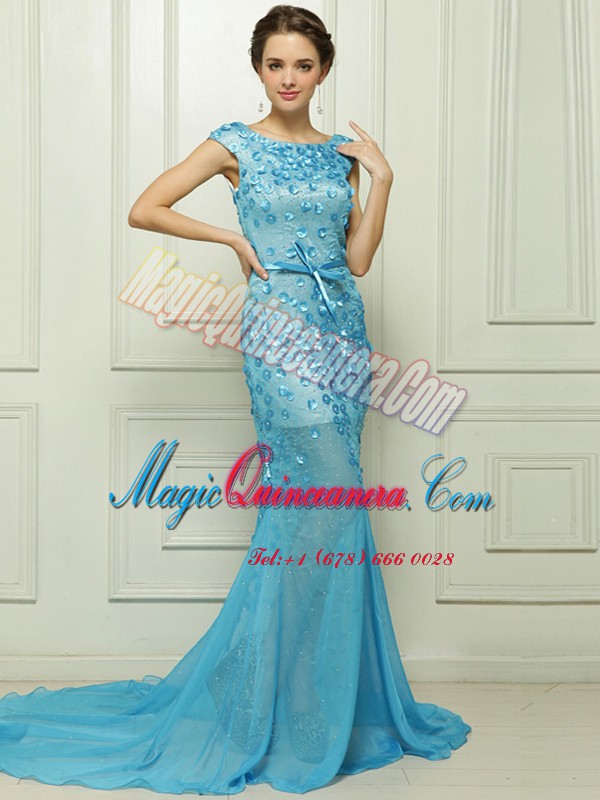 Cute Mermaid Sleeveless Chiffon With Brush Train Zipper Prom Dress in Baby Blue with Beading and Appliques