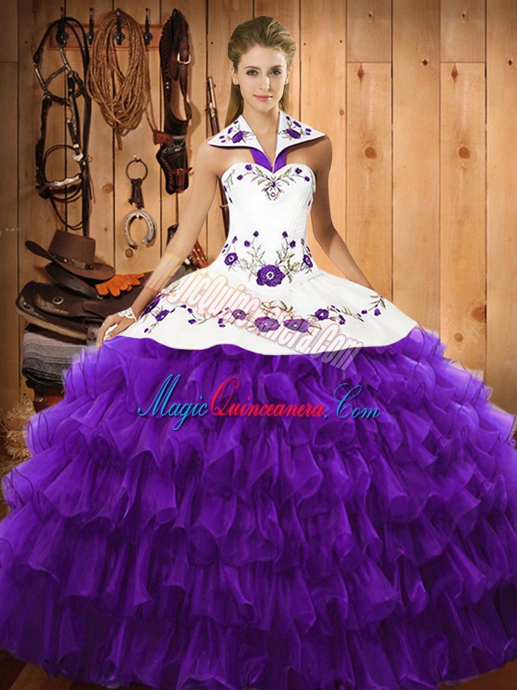 Cute Organza Halter Top Sleeveless Lace Up Embroidery and Ruffled Layers Quinceanera Dress in Purple