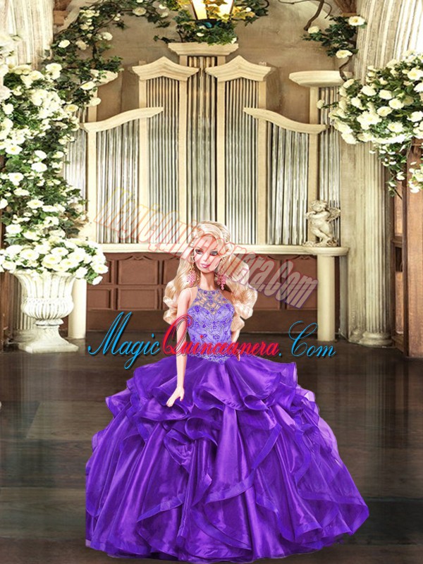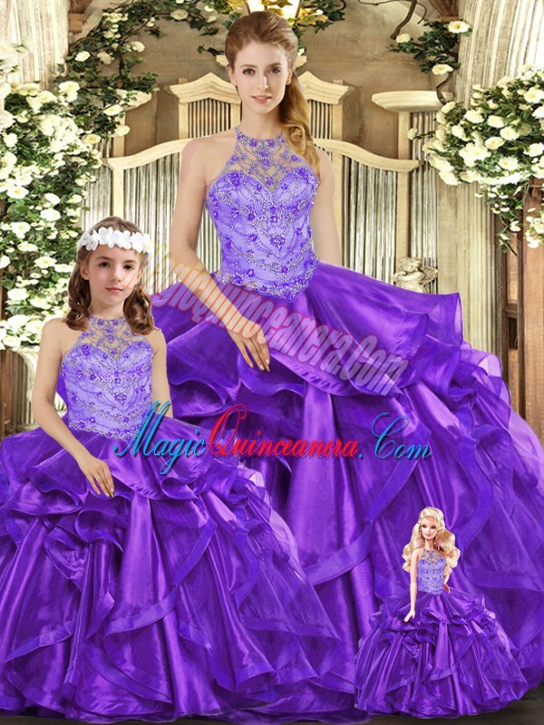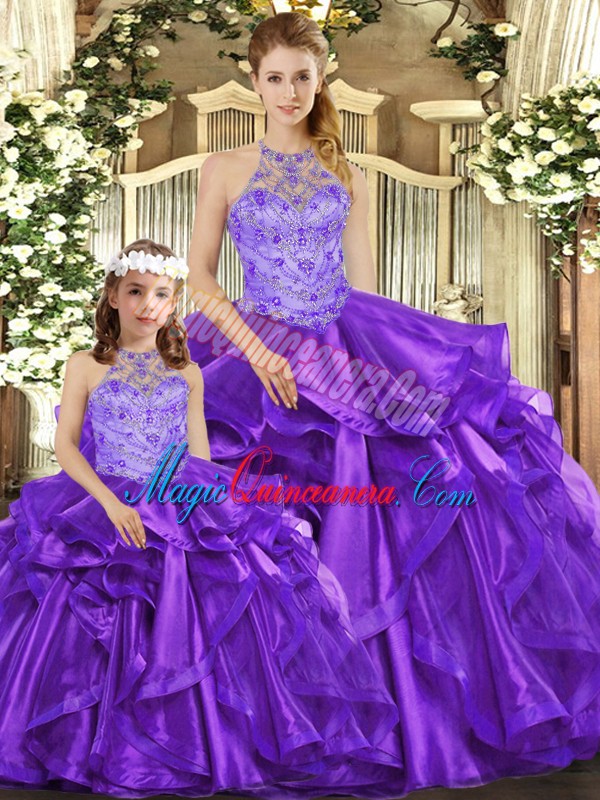 Cute Purple Lace Up Halter Top Beading and Ruffles 15 Quinceanera Dress Organza Sleeveless
