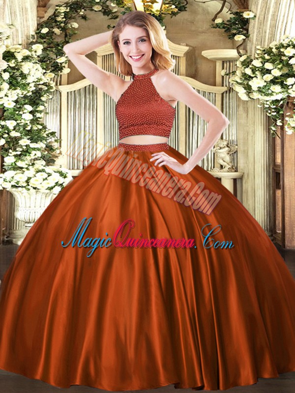 Cute Rust Red Halter Top Neckline Beading Sweet 16 Dresses Sleeveless Backless