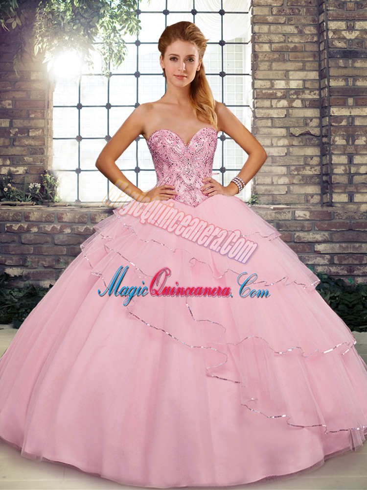 , Cute Sleeveless Brush Train Beading and Ruffled Layers Lace Up Quince Ball Gowns