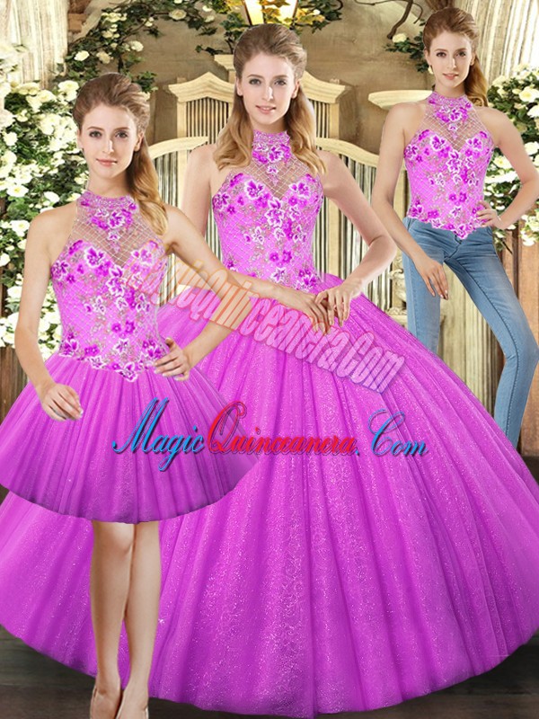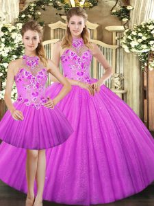 Cute Sleeveless Tulle Floor Length Lace Up Quince Ball Gowns in Lilac with Embroidery