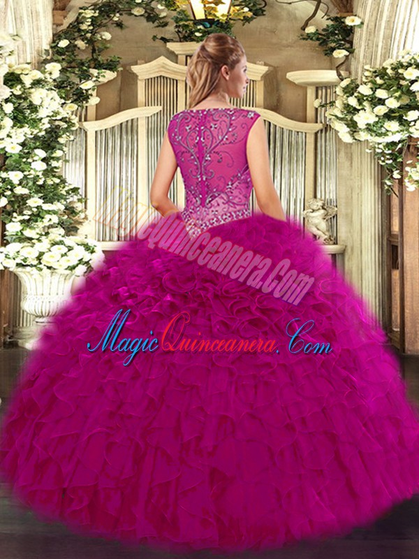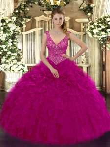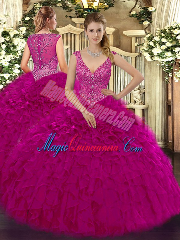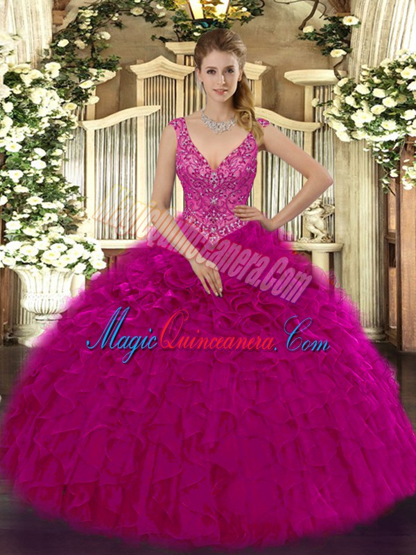Cute V-neck Sleeveless Organza Quinceanera Gowns Beading and Ruffles Zipper