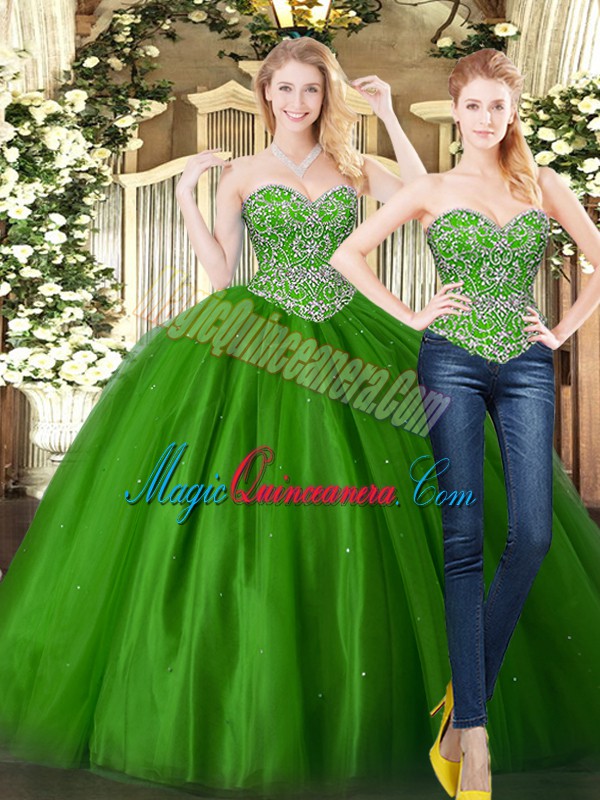 Dark Green Ball Gowns Tulle Sweetheart Sleeveless Beading Floor Length Lace Up Quince Ball Gowns