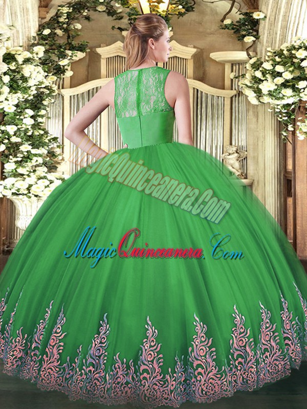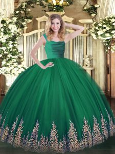 Dark Green Tulle Zipper Straps Sleeveless Floor Length Quinceanera Gown Lace and Appliques