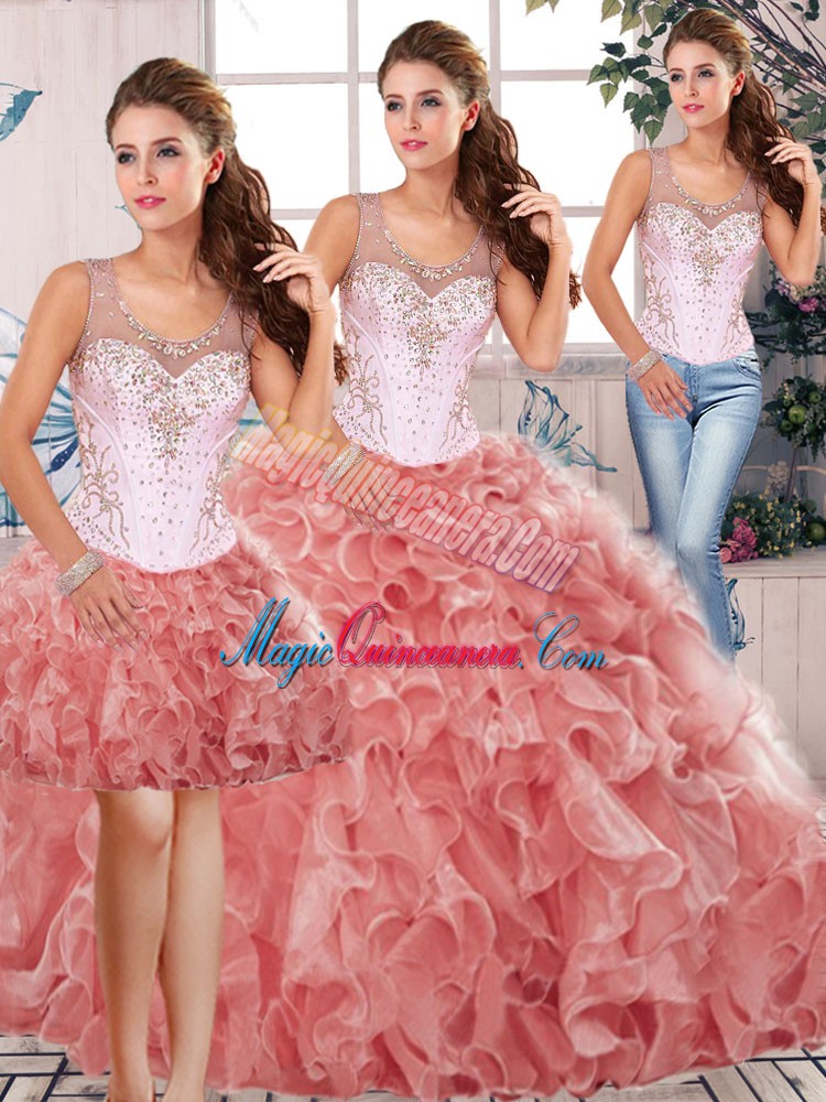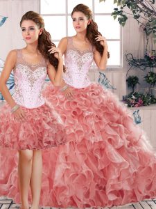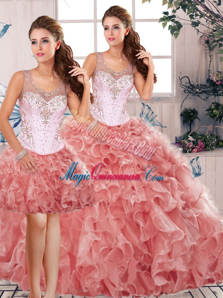 Dazzling Beading and Ruffles Quince Ball Gowns Watermelon Red Clasp Handle Sleeveless Floor Length