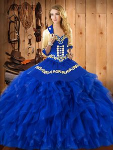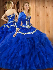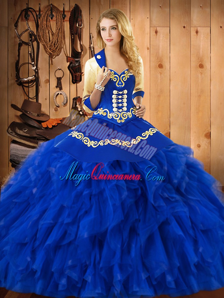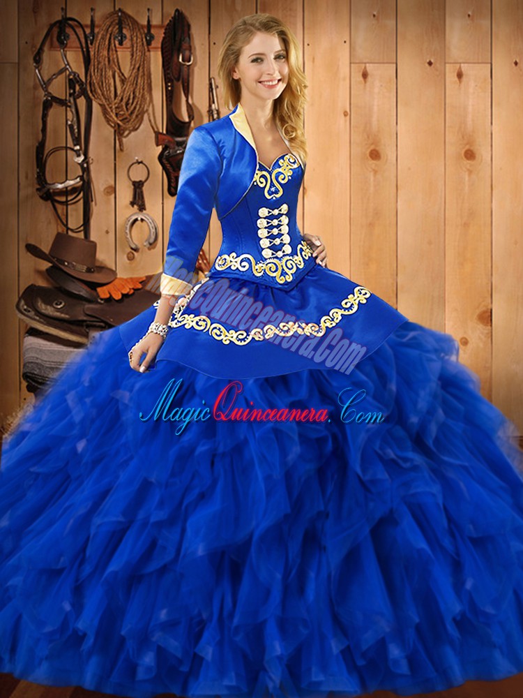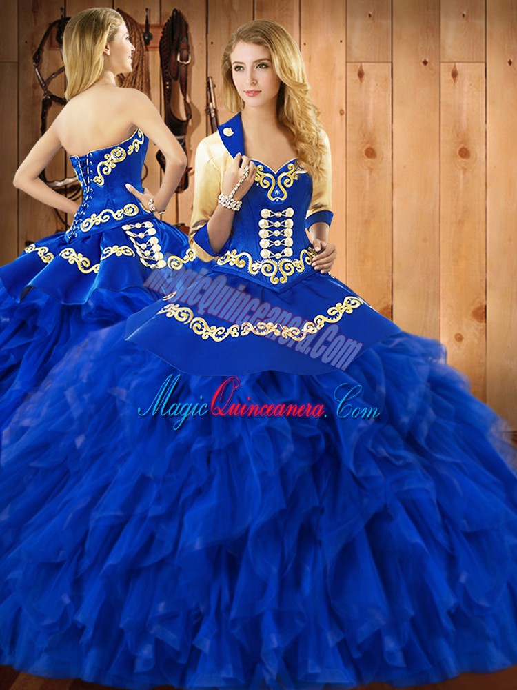 Dazzling Blue Lace Up Sweetheart Embroidery and Ruffles Quinceanera Gown Satin and Organza Sleeveless