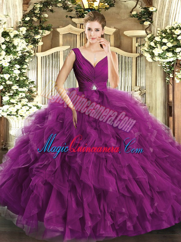 Dazzling Fuchsia Ball Gowns Organza V-neck Sleeveless Beading Floor Length Backless Sweet 16 Quinceanera Dress