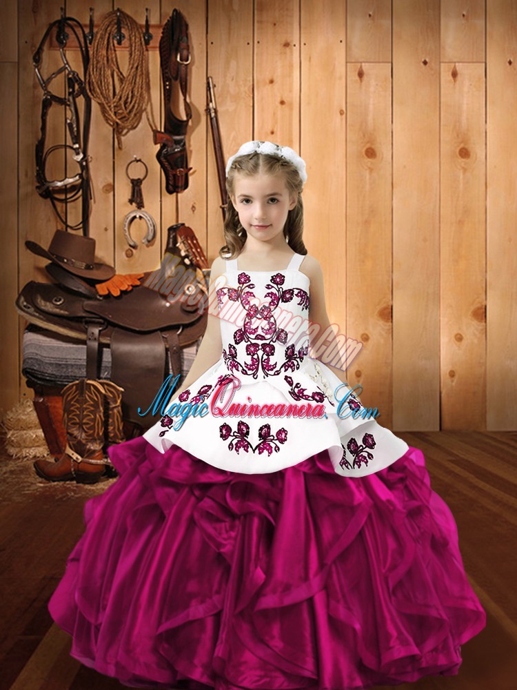 Dazzling Fuchsia Organza Lace Up Straps Sleeveless Floor Length High School Pageant Dress Embroidery and Ruffles