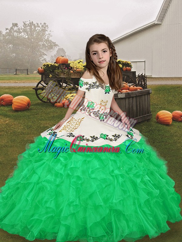 Dazzling Green Ball Gowns Straps Sleeveless Organza Floor Length Lace Up Embroidery and Ruffles Child Pageant Dress