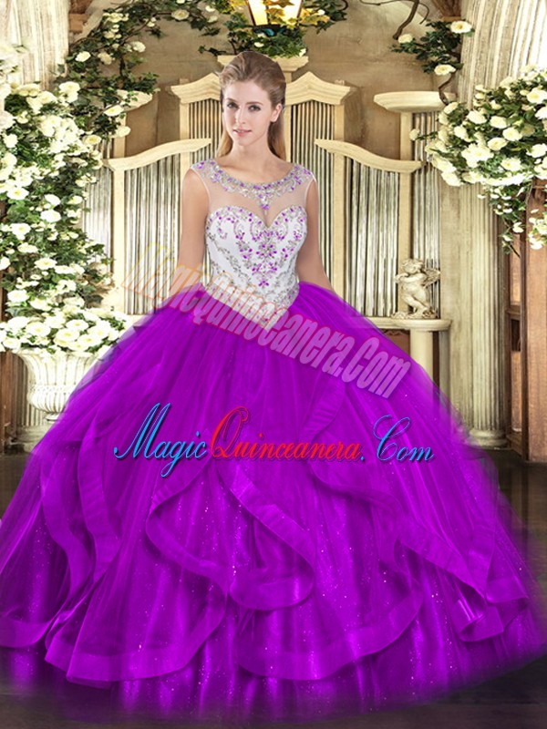 Dazzling Sleeveless Floor Length Beading and Ruffles Zipper Quinceanera Dress with Eggplant Purple
