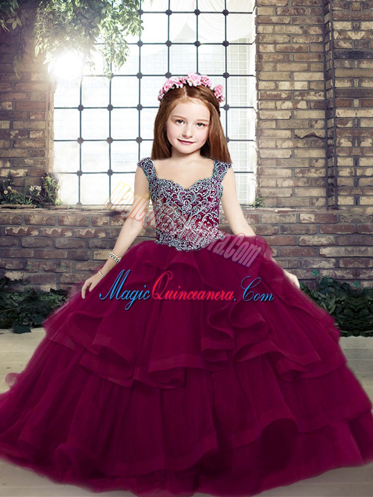 Dazzling Straps Sleeveless Tulle Girls Pageant Dresses Beading and Ruffles Lace Up
