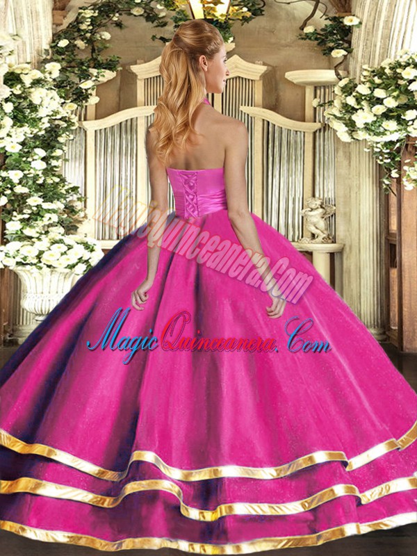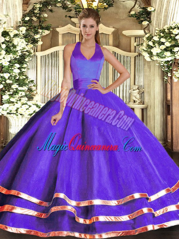 Decent Purple Ball Gowns Halter Top Sleeveless Tulle Floor Length Lace Up Ruffled Layers 15th Birthday Dress - Magic Quinceanera