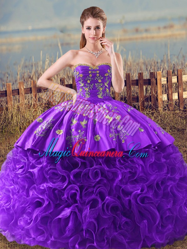 Decent Purple Sleeveless Fabric With Rolling Flowers Brush Train Lace Up Ball Gown Prom Dress for Sweet 16 and Quinceanera