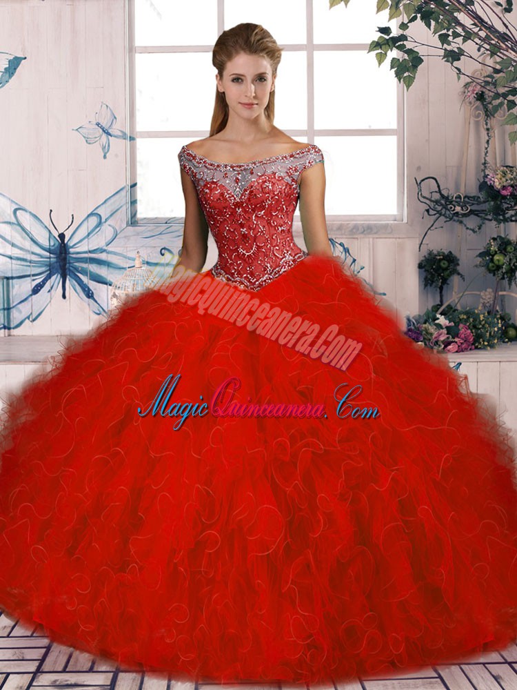 Decent Red Ball Gowns Tulle Off The Shoulder Sleeveless Beading and Ruffles Lace Up 15 Quinceanera Dress Brush Train