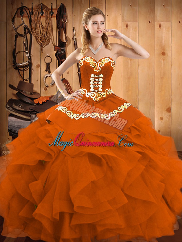 Decent Rust Red Ball Gowns Satin and Organza Sweetheart Sleeveless Embroidery and Ruffles Floor Length Lace Up Sweet 16 Dress