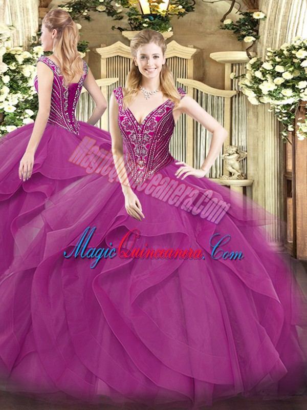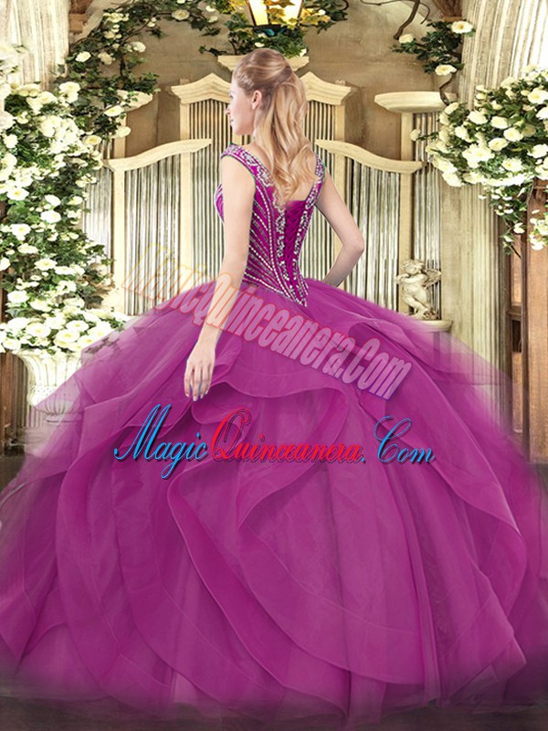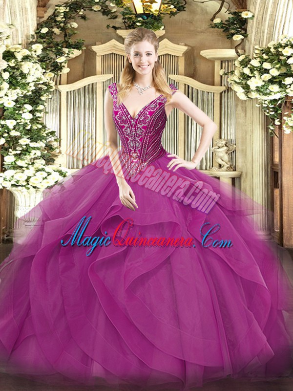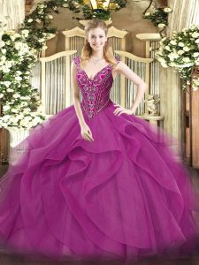 Decent Sleeveless Tulle Floor Length Lace Up Quince Ball Gowns in Lilac with Beading and Ruffles