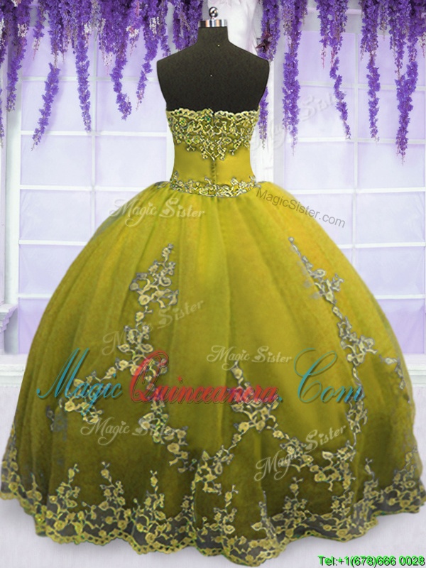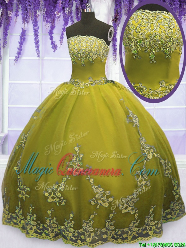 Decent Strapless Sleeveless Sweet 16 Dresses Floor Length Appliques Olive Green Tulle