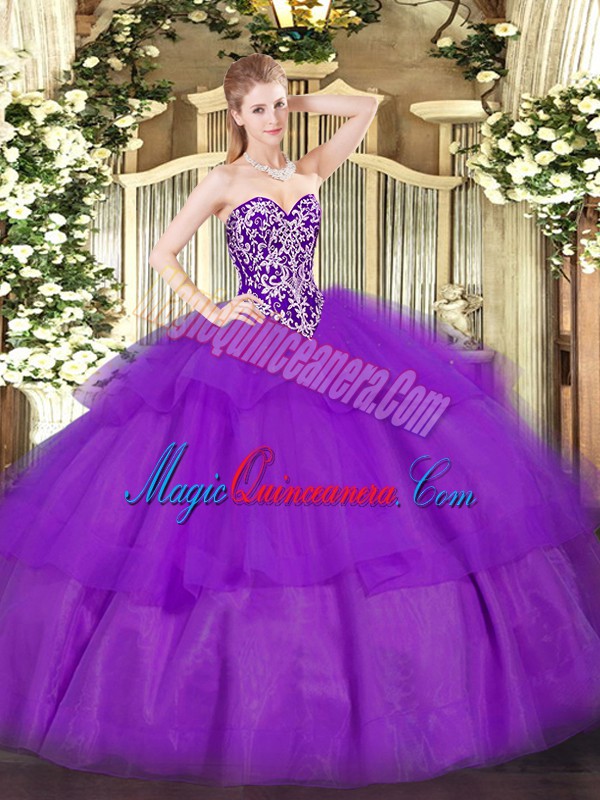 Decent Tulle Sweetheart Sleeveless Lace Up Beading and Ruffled Layers 15th Birthday Dress in Purple