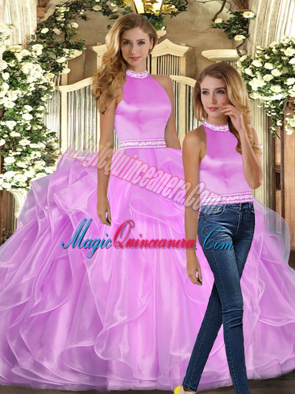 Decent Two Pieces Vestidos de Quinceanera Lilac Halter Top Organza Sleeveless Floor Length Backless