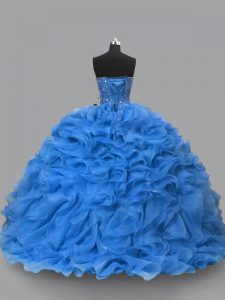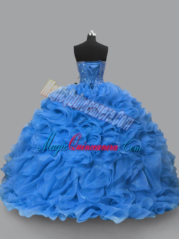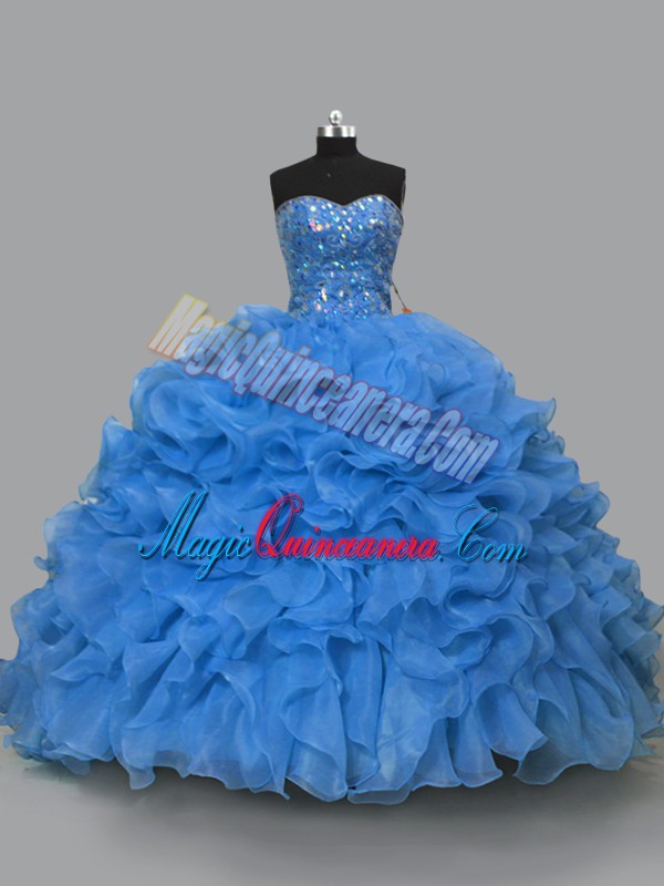 Delicate Floor Length Lace Up Sweet 16 Dresses Blue for Sweet 16 and Quinceanera with Beading and Ruffles