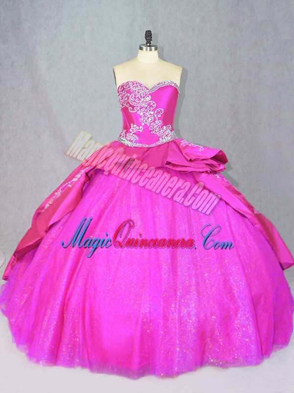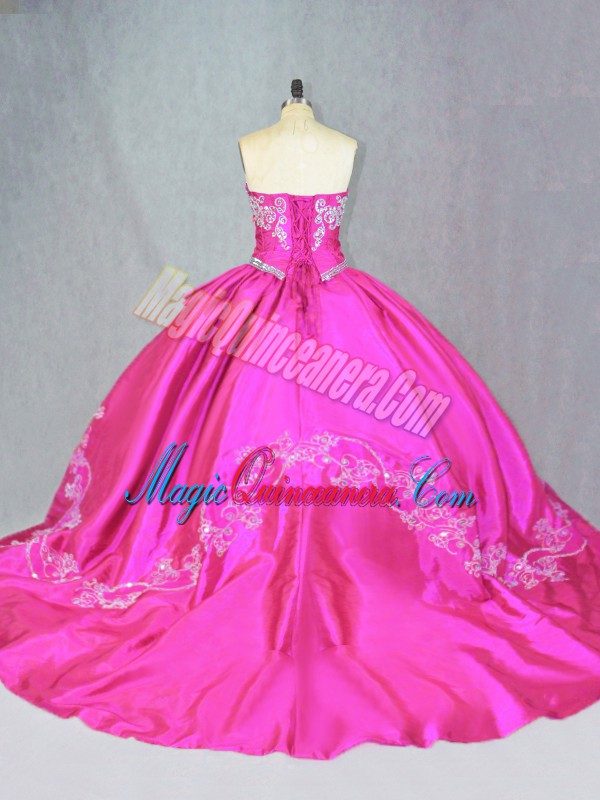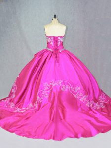 Delicate Hot Pink Quince Ball Gowns Satin and Tulle Court Train Sleeveless Beading and Embroidery