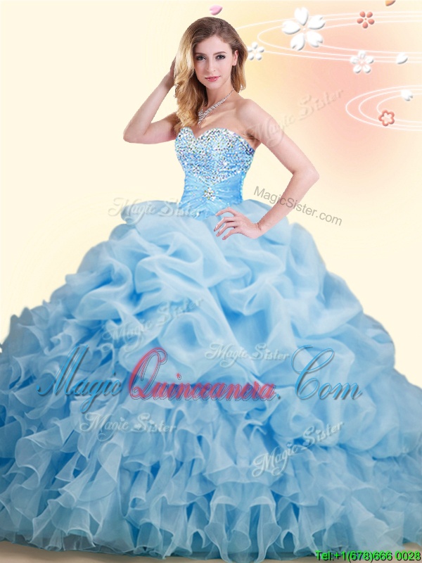 Delicate Pick Ups With Train Ball Gowns Sleeveless Baby Blue Quinceanera Gowns Brush Train Lace Up