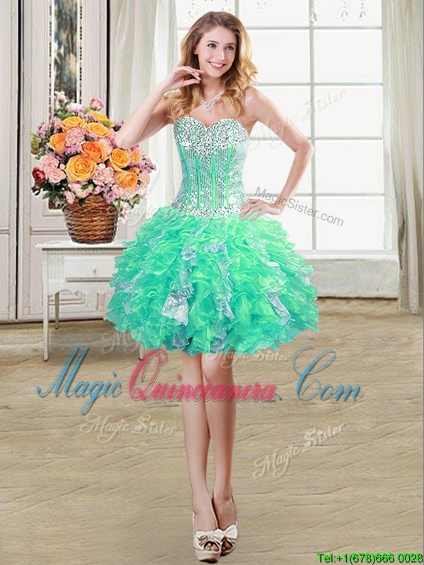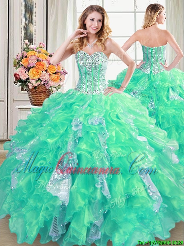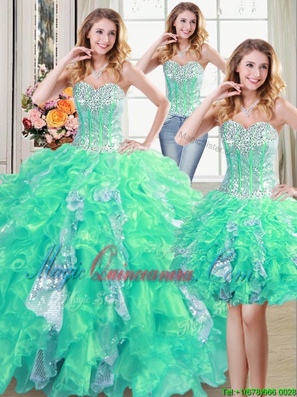 Delicate Three Piece Sweetheart Sleeveless Organza Vestidos de Quinceanera Beading and Ruffles and Sequins Lace Up