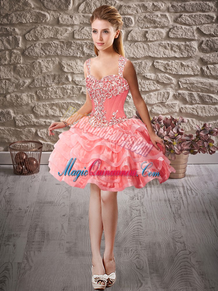 Delicate Watermelon Red Ball Gowns Straps Sleeveless Organza Court Train Lace Up Beading and Ruffled Layers Sweet 16 Quinceanera Dress - Magic Quinceanera