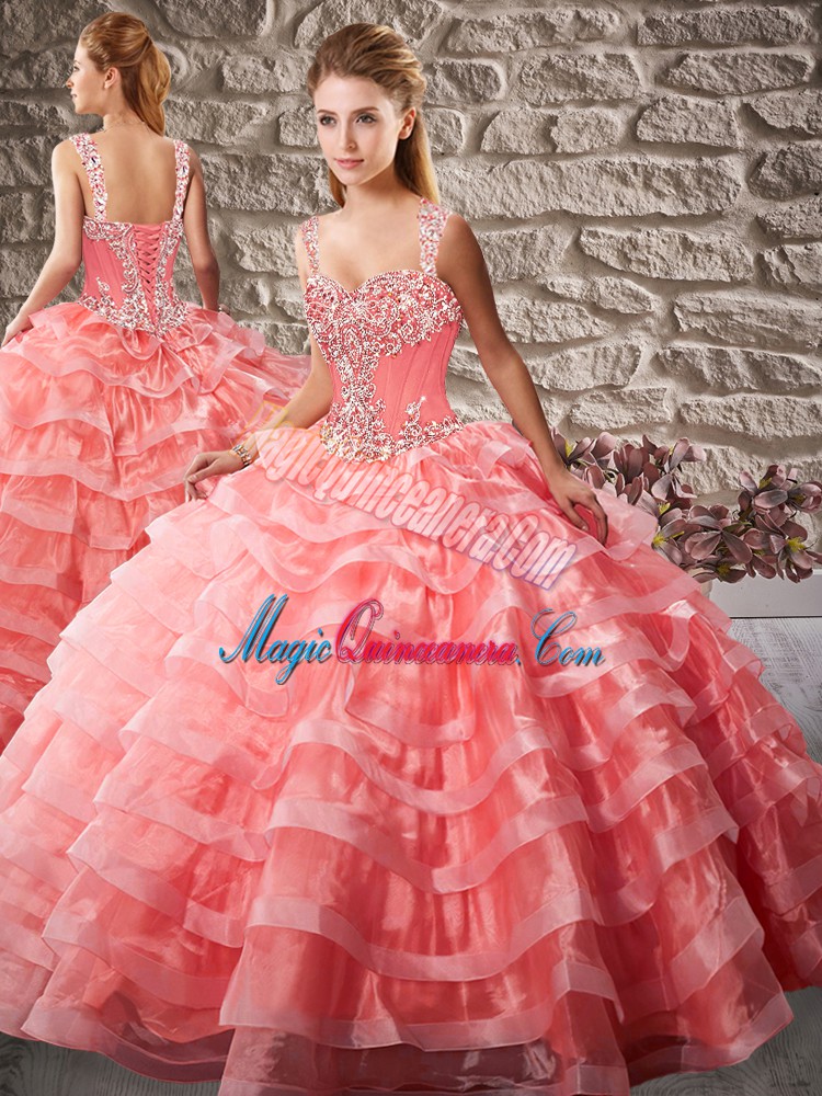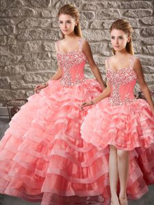 Delicate Watermelon Red Ball Gowns Straps Sleeveless Organza Court Train Lace Up Beading and Ruffled Layers Sweet 16 Quinceanera Dress