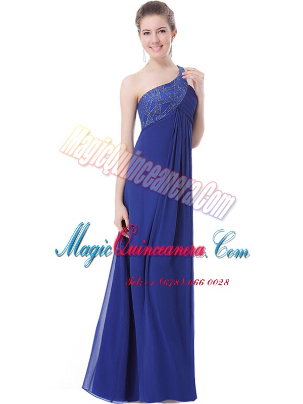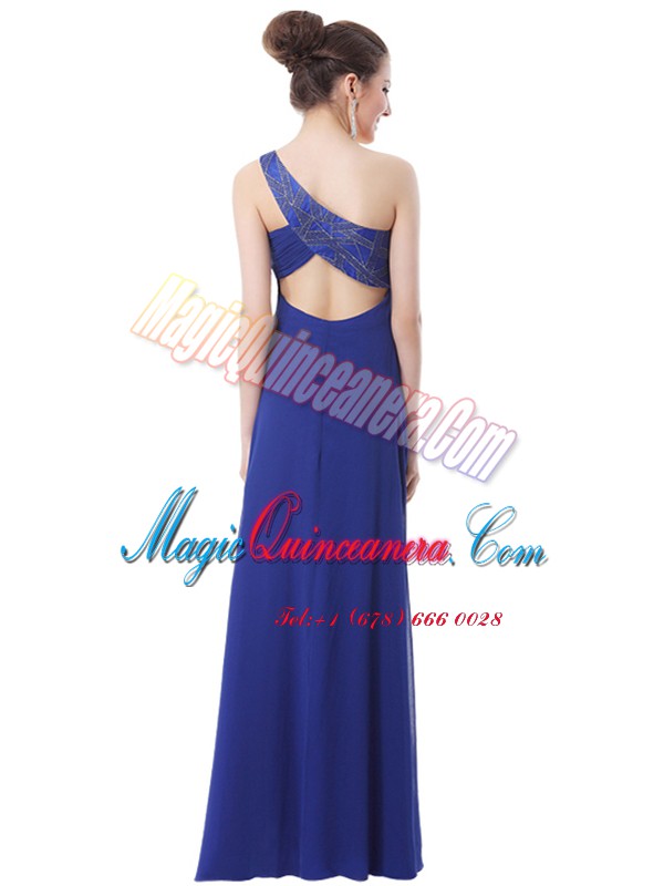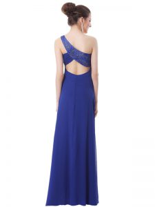 , Deluxe Floor Length Blue Prom Evening Gown One Shoulder Sleeveless Criss Cross