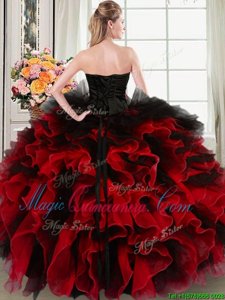 Deluxe Floor Length Lace Up Quinceanera Dress Black and Red and In for Military Ball and Sweet 16 and Quinceanera with Beading and Ruffles and Hand Made Flower