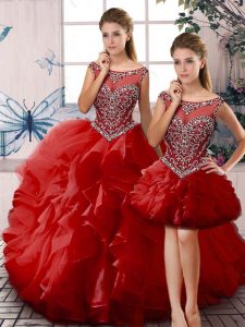 , Deluxe Floor Length Red Quinceanera Dress Organza Sleeveless Beading and Ruffles