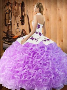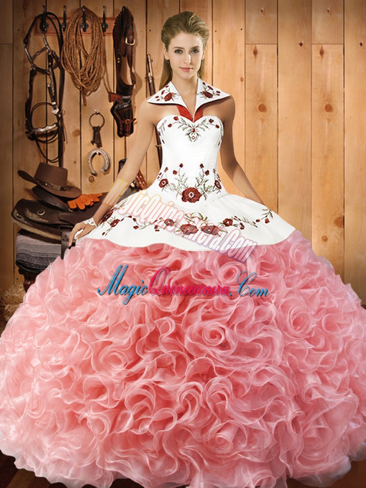 Deluxe Floor Length Watermelon Red Quinceanera Dresses Halter Top Sleeveless Lace Up
